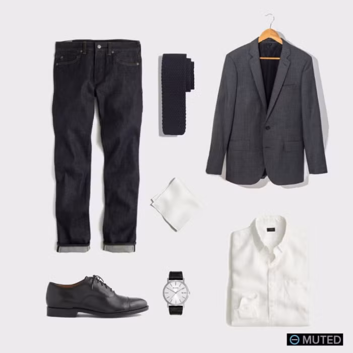 Khi muốn tạo hình ảnh lịch lãm nhưng không quá trang trọng, hãy nhớ đến 4 món cơ bản: blazer, quần jeans, áo sơ mi trắng và giầy da. Bạn có thể thêm cà vạt và khăn bỏ túi áo nếu muốn tạo điểm nhấn. Bộ trang phục này thích hợp để đi dự tiệc cưới hoặc tiệc của công ty.