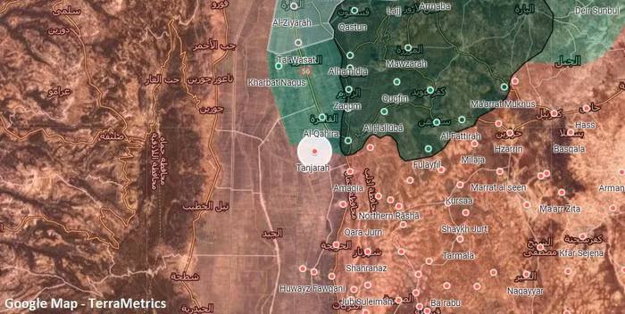 Bản đồ quân sự Idlib, điểm trắng là thị trấn Tanjarah phía tây bắc Hama