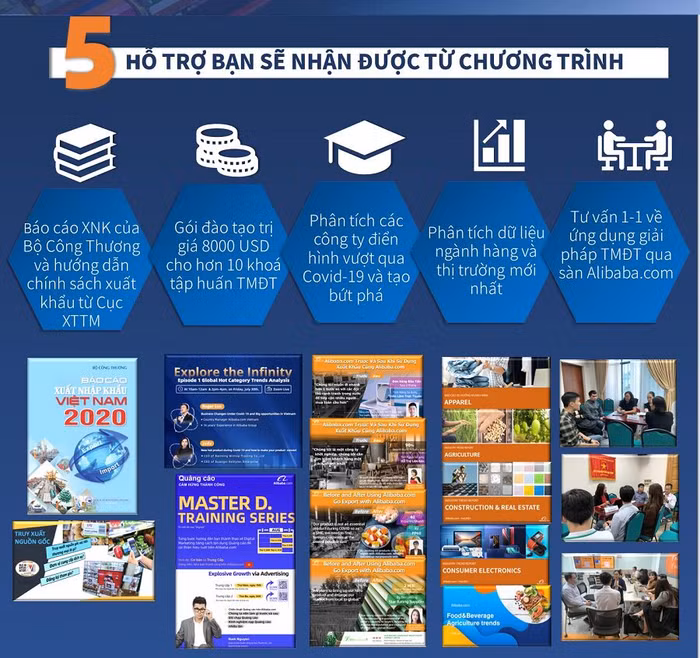 Theo đó, chương trình sẽ cung cấp những cập nhật về chính sách thương mại điện tử (TMĐT) và tư liệu tập huấn mới nhất từ Vietrade và Bộ Công thương; sẽ có hơn 10 khoá tập huấn TMĐT độc quyền lần đầu tiên được tổ chức trị giá 8.000 đô la Mỹ; giúp doanh nghiệp đưa ra những quyết định kinh doanh thức thời với tỉ lệ thành công cao, bằng những phân tích sâu sắc về số liệu và thị trường từ Alibaba.com.