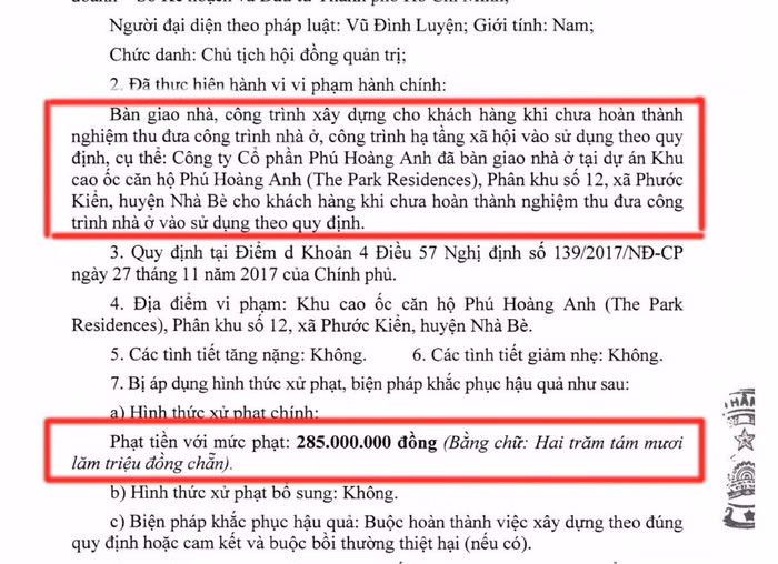 Quyết định xử phạt vi phạm hành chính trong hoạt động kinh doanh bất động sản, phát triển nhà ở của UBND TP.HCM nêu rõ: Công ty CP Phú Hoàng Anh bị xử phạt 285 triệu đồng vì bàn giao nhà ở tại dự án Khu cao ốc căn hộ (The Park Residence), phân khu số 12, xã Phước Kiểng, huyện Nhà Bè cho khách hàng khi chưa hoàn thành nghiệm thu công trình nhà ở vào sử dụng theo quy định.
