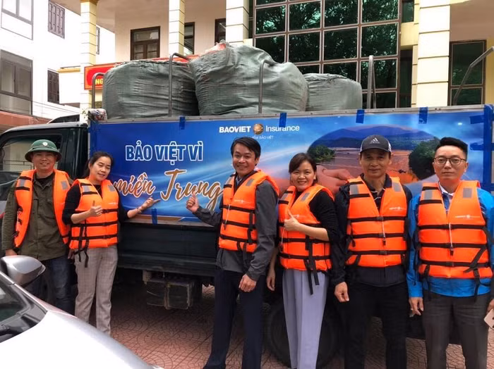 Bên cạnh đó, Tập đoàn Bảo Việt cũng trực tiếp đưa các chuyến xe chở hàng cứu trợ từ Hà Nội về các tỉnh miền Trung chịu ảnh hưởng nặng nề, phối hợp các công ty Bảo Việt tại địa phương đi thuyền, lội nước đến từng hộ gia đình để trao tận tay món quà thiết thực như áo phao, áo mưa bộ, nước uống đóng chai, đồ ăn cùng nhiều nhu yếu phẩm cần thiết khác.