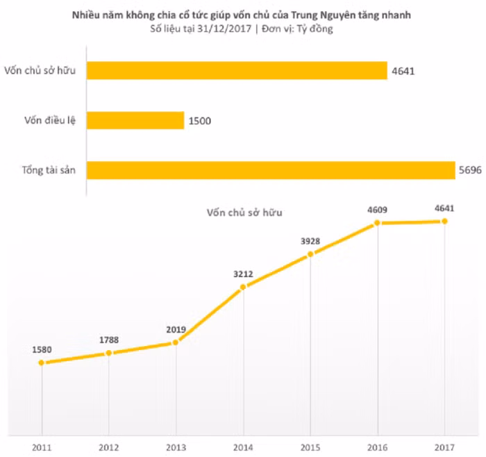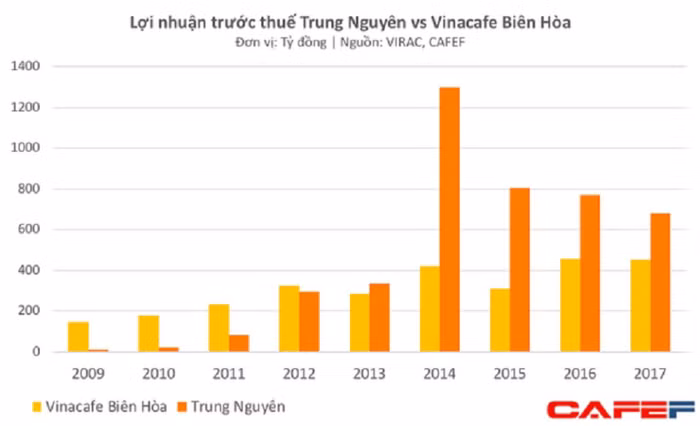 Năm 2014, Trung Nguyên ghi nhận 1.300 tỷ đồng lợi nhuận trước thuế - gấp 4 lần so với năm 2013. Bên cạnh hoạt động kinh doanh tốt lên thì một nguyên nhân đáng kể khác đưa lợi nhuận 2014 tăng vọt là do trong năm này các công ty con chủ chốt của Trung Nguyên như CTCP Cà phê Trung Nguyên, CTCP Cà phê hòa tan Trung Nguyên đã kết chuyển hàng trăm tỷ đồng lợi nhuận tích lũy được trong giai đoạn 2012-2014 về cho công ty mẹ dẫn đến doanh thu tài chính tăng đột biến lên 518 tỷ đồng.