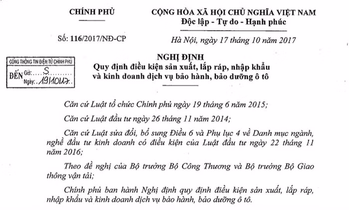 Theo Bộ Công Thương, khi Nghị định 116 của Chính phủ có hiệu lực, việc nhập khẩu ô tô bị chững lại trong các tháng đầu năm 2018. Nhưng từ tháng 6 năm 2018, nhiều doanh nghiệp đã được cấp giấy phép kinh doanh nhập khẩu ô tô, đã được phía nước ngoài cấp VTA và được Bộ Giao thông vận tải chấp nhận nên nhập khẩu ô tô đã gia tăng rất mạnh.