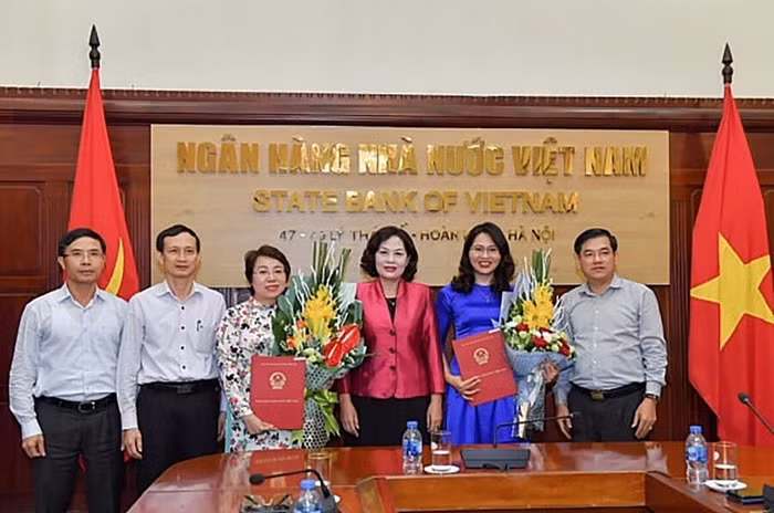Phó Thống đốc NHNN Nguyễn Thị Hồng trao quyết định, chúc mừng các nhân sự được bổ nhiệm. Ảnh: VGP.