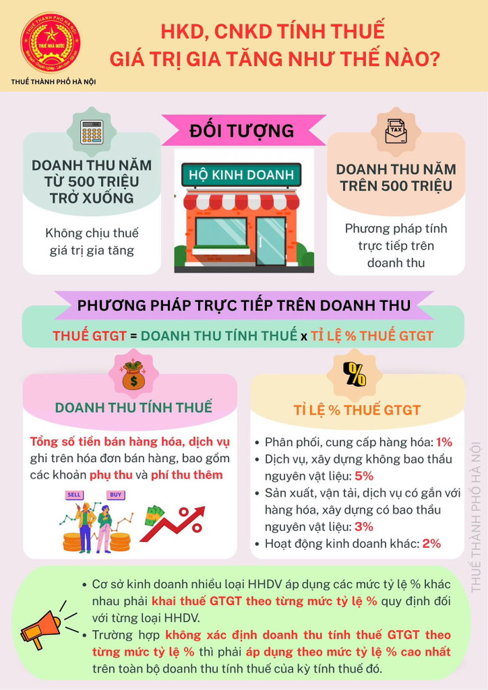 Về cách tính thuế giá trị gia tăng đối với hộ kinh doanh, đối tượng áp dụng là hộ kinh doanh. Trường hợp doanh thu năm từ 500 triệu đồng trở xuống thì không chịu thuế giá trị gia tăng. Trường hợp doanh thu năm trên 500 triệu đồng thì áp dụng phương pháp tính trực tiếp trên doanh thu, trong đó thuế giá trị gia tăng được xác định bằng doanh thu tính thuế nhân với tỷ lệ phần trăm thuế giá trị gia tăng.
