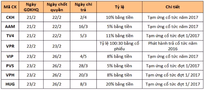 Tuần đầu tiên sau kỳ nghỉ Tết Nguyên đán 2018, nhiều doanh nghiệp thực hiện chốt quyền cổ tức bằng tiền. Cao nhất tuần là Tổng Công ty may Hưng Yên - Công ty Cổ phần (mã: HUG) giao dịch trên sàn UPCoM thực hiện chốt quyền tạm ứng cổ tức đợt 1/2017, tỷ lệ 20% bằng tiền.
