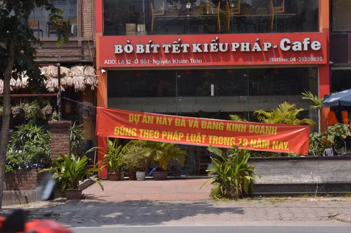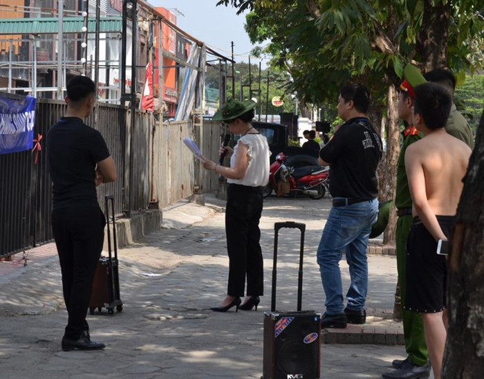 Đoàn công tác của UBND Quận Cầu Giấy tiến hành đọc quyết định thi hành cưỡng chế đối với các cơ sở kinh doanh không chấp hành quyết định.