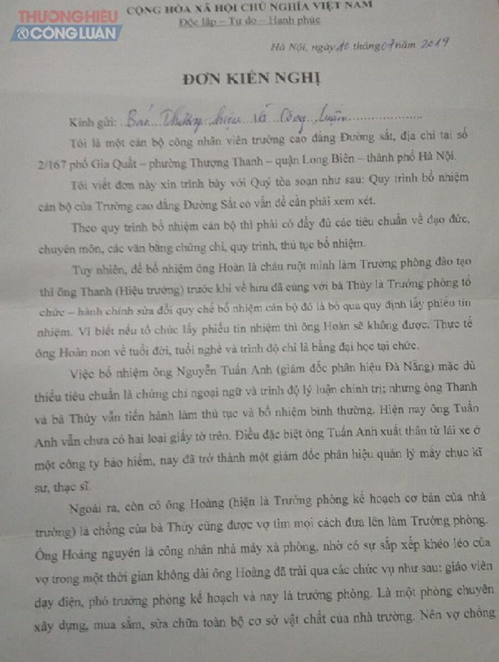 Ngoài ra, nội dung đơn thư cũng nêu rõ, việc bổ nhiệm nhiều cán bộ giữ chức vụ Trưởng phòng (ông Phạm Ngọc Hoàn- Trưởng phòng Đào tạo; ông Nguyễn Tuấn Anh - Giám đốc phân hiệu Đà Nẵng; Trần Đức Hoàng - Trưởng phòng quản lý TB &Xây dựng cơ bản; bà Võ Thị Bích Thủy - Trưởng phòng Tổ chức - Hành Chính...) tại Trường Cao đẳng Đường sắt có dấu hiệu chưa đủ điều kiện, sai quy trình, quy định của pháp luật?