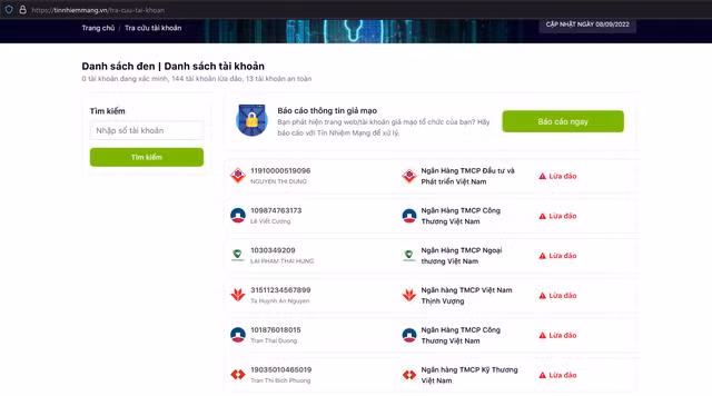 Trường hợp nghi ngờ một tài khoản nào đó là lừa đảo, người dùng có thể nhập số tài khoản vào ô tìm kiếm để kiểm tra xem tài khoản này đã được xác nhận là lừa đảo hay không.