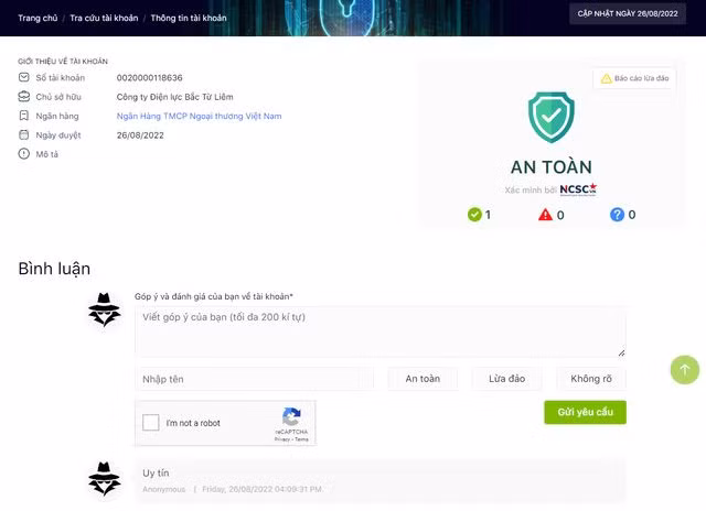 Nếu không tìm thấy kết quả, người dùng có thể báo cáo tài khoản nghi ngờ/có dấu hiệu lừa đảo để NCSC kiểm duyệt thông tin và bổ sung vào danh sách tài khoản lừa đảo để cảnh báo đến mọi người. Ngoài ra, người dùng cũng có thể báo cáo về một tài khoản uy tín để được xác nhận là tài khoản chính chủ (an toàn) sau khi đội ngũ của Trung tâm kiểm duyệt.