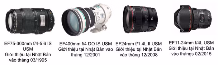 Với ống kính EF, từ khi ra mắt ống kính EF đầu tiên, cùng với dòng EOS năm 1987, Canon đã liên tục tích hợp vào các ống kính EF những công nghệ đầu tiên trên thế giới, như ống kính EF75-300mm f/4-5.6 IS USM có khả năng chống rung được ra mắt tại Nhật Bản năm 1995, ống kính EF400mm f/4 DO IS USM với thấu kính DO được giới thiệu tại Nhật Bản năm 2008. Hơn nữa, vào năm 2015, Canon còn giới thiệu ống kính EF11-24mm f/4L USM tại Nhật Bản; đây là ống kính đầu tiên trên thế giới có thể zoom góc siêu rộng, đạt được tiêu cự 11 mm.