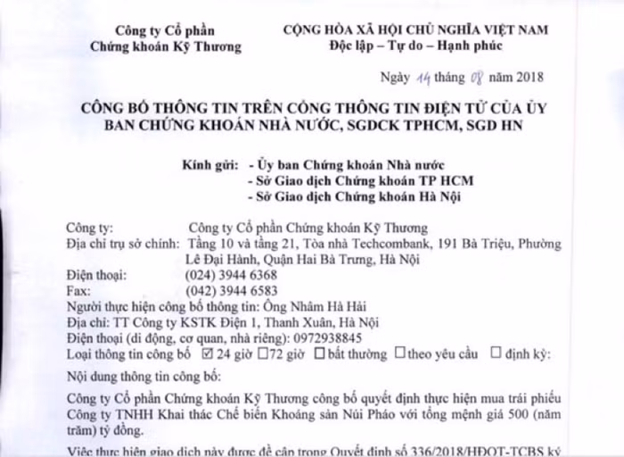 Trước đó một ngày (14/8), thông tin từ HOSE cho biết, CTCP Chứng khoán Kỹ thương - công ty con 100% vốn đầu tư của Ngân hàng Techcombank đã chi 500 tỷ đồng để mua trái phiếu của Công ty TNHH Khai thác Chế biến khoáng sản Núi Pháo.