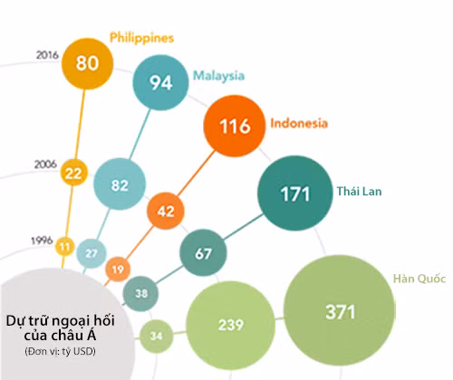 Tổng dự trữ của 5 nền kinh tế lớn tại Đông Nam Á - Thái Lan, Indonesia, Malaysia, Philippines, Việt Nam đã vượt 500 tỷ USD cuối năm ngoái. Con số này cao gấp 5 thời điểm 1996.