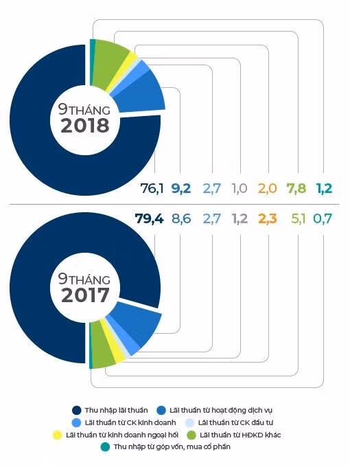 Thực tế, trong 9 tháng năm 2018, các ngân hàng vẫn đua nhau báo những con số lợi nhuận ấn tượng và dự kiến nhiều ngân hàng vượt chỉ tiêu lợi nhuận năm. Bên cạnh nguồn thu chính từ tín dụng,"con gà đẻ trứng vàng" của nhiều ngân hàng chính là mảng dịch vụ.
