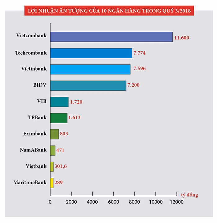Tính đến ngày 30/9/2018, hầu hết các ngân hàng đều đi đúng tiến độ và thậm chí còn vượt kế hoạch lợi nhuận đề ra của năm 2018. Tổng lợi nhuận trước thuế ngành ngân hàng đạt hơn 67.000 tỷ đồng, tăng 41% so với cùng kỳ, trong đó có 16/26 ngân hàng tăng trưởng trên 41%.