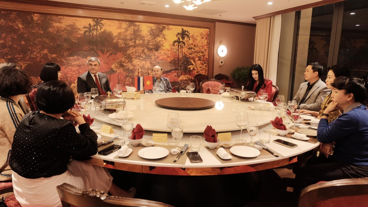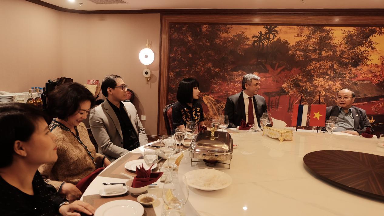 Không gian đón tiếp được lựa chọn là một nhà hàng thuần Việt với phong cách tinh tế, nhẹ nhàng, tạo nên bầu không khí gần gũi, thân tình. Chủ tịch Nguyễn Hồng Sơn đã giới thiệu tới vị khách Nga những món ăn đặc sản của làng gốm Bát Tràng (Hà Nội), mang đậm dấu ấn văn hóa và ẩm thực truyền thống Việt Nam.