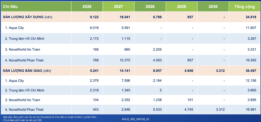 Giai đoạn 2026–2030, Novaland dự kiến bàn giao 36.497 sản phẩm. Riêng năm 2027 chiếm hơn 14.000 sản phẩm, tập trung tại Aqua City và NovaWorld Phan Thiết. Trong năm 2026, doanh nghiệp dự kiến triển khai xây dựng 9.122 sản phẩm và bàn giao 5.241 sản phẩm, với doanh thu kỳ vọng hơn 45.800 tỷ đồng và lợi nhuận dự án trên 14.300 tỷ đồng.