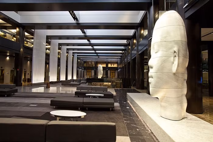 Nhưng vào khách sạn này, bạn có thể cần phải đeo kính râm để tránh bị ánh sáng rực rỡ chiếu vào mắt; đài phun nước hoành tráng được dát vàng với rất nhiều đèn pha lê khổng lồ. Tất cả mọi thứ phù hợp với phong cách Trump.