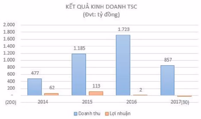 Kết quả kinh doanh giảm sút mạnh trong năm 2017 có thể là một trong những lý do tác động đến việc trượt giá của cổ phiếu TSC thời gian qua. Doanh thu cả năm chỉ đạt 825 tỷ đồng, giảm 50% so với năm 2016, và kèm với đó là khoản lỗ 30 tỷ đồng. Lợi nhuận sau thuế chưa phân phối năm 2017 chỉ còn 88 tỷ đồng, giảm 34 tỷ đồng so với năm ngoái khiến vốn chủ sở hữu cũng giảm xuống 1.857 tỷ đồng.