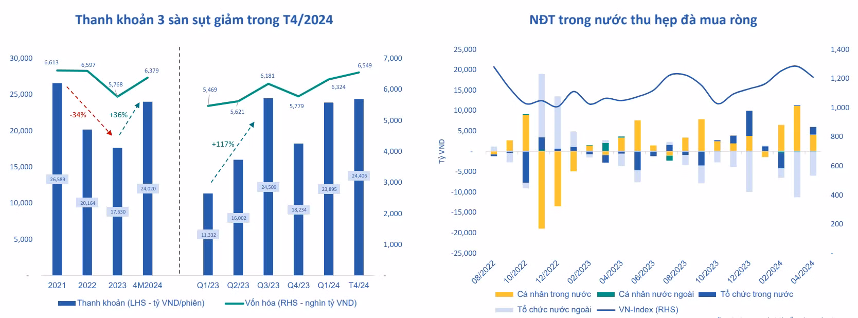Thanh khoản trung bình tháng 4/2024 trên cả 3 sàn đạt 24.406 tỷ đồng/phiên, giảm 18% so với trung bình tháng 3/2024. Thanh khoản sụt giảm trong bối cảnh căng thẳng địa chính trị leo thang, diễn biến phức tạp của tỷ giá và kết quả kinh doanh quý 1/2024 của nhiều doanh nghiệp lớn không như kỳ vọng trên nền giá cổ phiếu đã tăng cao từ đầu năm.