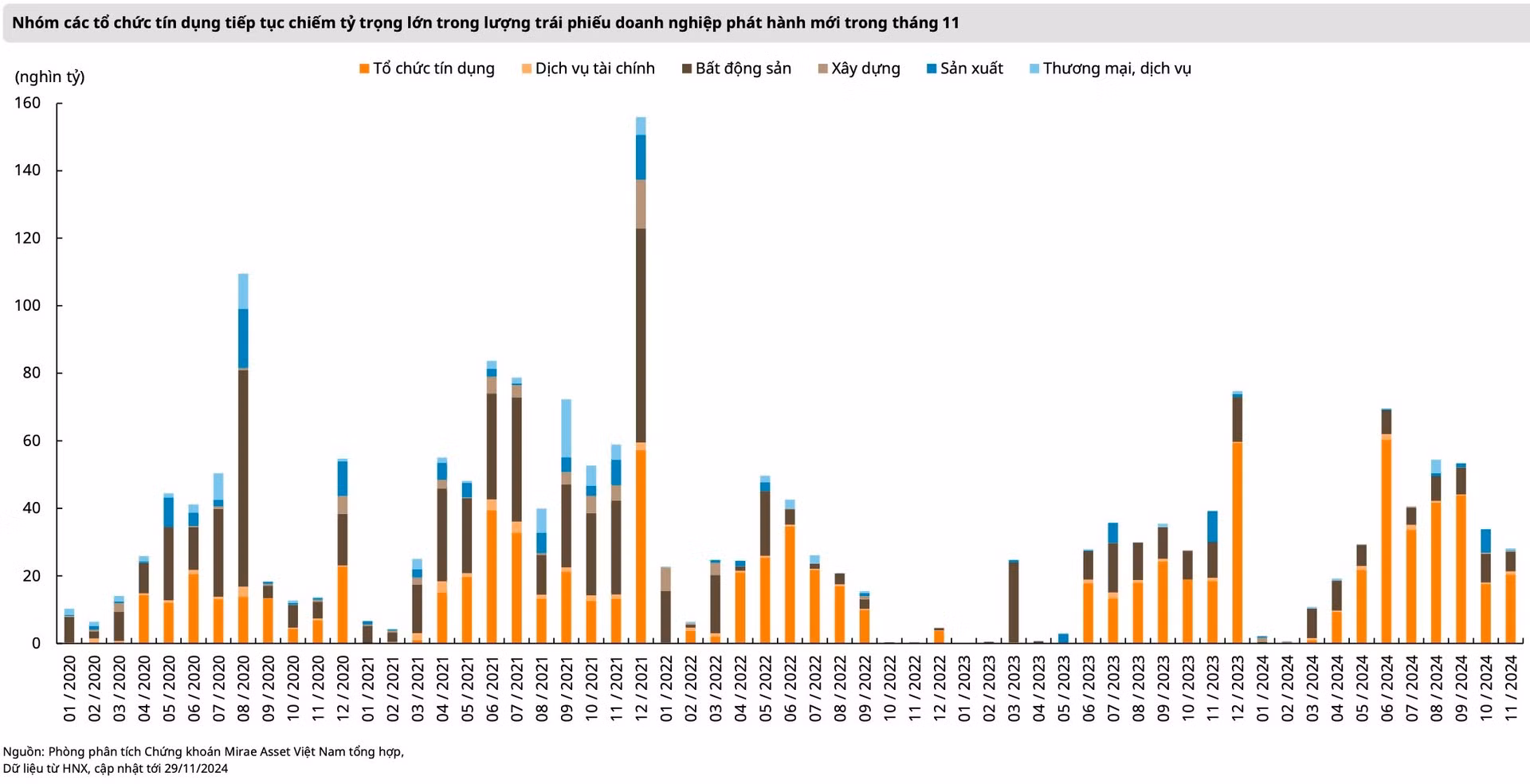 Dữ liệu của Mirae Asset cho thấy, khoảng 50 trái phiếu dự kiến sẽ đáo hạn trong tháng cuối cùng của năm 2024, với tổng giá trị đáo hạn đạt khoảng 39.000 tỷ đồng. Trong đó, khoảng 8.500 tỷ đồng đến từ lĩnh vực sản xuất; 7.000 tỷ đồng từ các doanh nghiệp xây dựng; 7.000 tỷ đồng khác từ lĩnh vực bất động sản; và các ngân hàng thương mại chiếm gần 6.000 tỷ đồng.