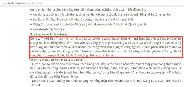 Cụ thể, trên website của mình, Siêu Thành giới thiệu “Công ty TNHH Siêu Thành là nơi hội tụ của các cổ đông sáng lập có nhiều kinh nghiệm, đặc biệt là Công ty CP Licogi 16 - là cổ đông lớn chiếm 100% vốn của công ty”.