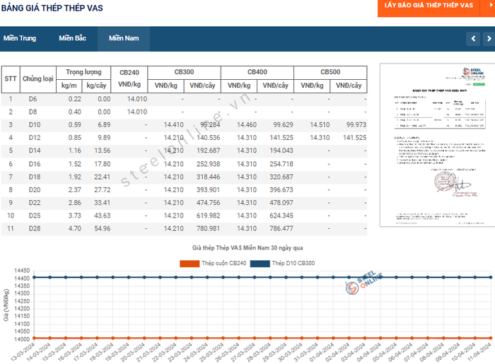 Thép VAS, hiện dòng thép cuộn CB240 ở mức 14.210 đồng/kg; thép thanh vằn D10 CB300 có giá 14.670 đồng/kg.