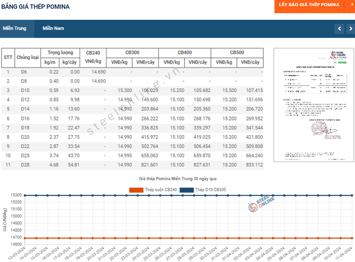 Thép Pomina, với dòng thép cuộn CB240 ở mức 14.690 đồng/kg; thép thanh vằn D10 CB300 có giá 15.300 đồng/kg.