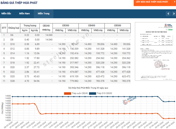 Thép tại miền Trung duy trì mức giá cũ. Thép Hòa Phát, với dòng thép cuộn CB240 dừng ở mức 14.040 đồng/kg; thép thanh vằn D10 CB300 có giá 14.390 đồng/kg.