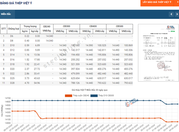 Thương hiệu thép Việt Ý, dòng thép cuộn CB240 có giá 14.040 đồng/kg; thép thanh vằn D10 CB300 có giá 14.540 đồng/kg.