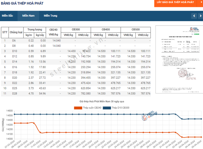 Tại miền Bắc, giá giao dịch các dòng thép ổn định. Thương hiệu thép Hòa Phát, với dòng thép cuộn CB240 ở mức 14.040 đồng/kg; thép thanh vằn D10 CB300 có giá 14.430 đồng/kg.