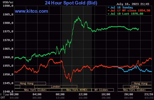 Giá vàng thế giới rạng sáng hôm nay tăng mạnh với giá vàng giao ngay tăng 23,9 USD lên mức 1.977,9 USD/ounce. Vàng tương lai tháng 8 giao dịch lần cuối ở mức 1.980,8 USD/ounce, tăng 24,4 USD so với rạng sáng ngày trước đó.