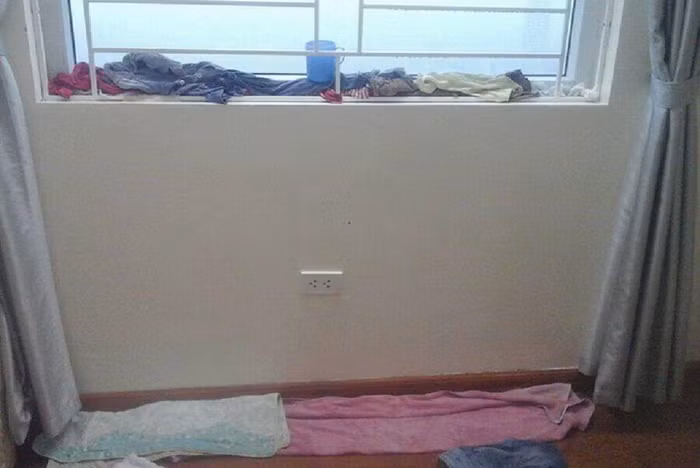 Trong khi các căn hộ khác đang vật lộn với tình trạng sập trần liên tục xảy ra thì hàng vài chục căn hộ khác thuộc trục 07A phải vật lộn với tình trạng nước chảy thành dòng ồ ạt đổ vào nhà qua khe cửa sổ. Nước chảy lênh láng ngấm vào sàn gỗ, người dân phải dùng giẻ và khăn lâu thấm nước liên tục.