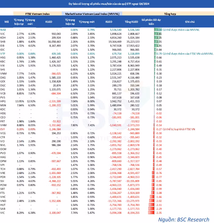 Tổng hợp cả hai ETF, BSC dự báo trong đợt cơ cấu quý 4/2024, các mã có thể được mua vào nhiều nhất theo khối lượng gồm SHB (35,2 triệu cổ phiếu), EIB (17,9 triệu cổ phiếu), VIX (9 triệu cổ phiếu), NAB (5,5 triệu cổ phiếu), KDH (5 triệu cổ phiếu), KBC (4,7 triệu cổ phiếu), DXG (4,1 triệu cổ phiếu)...