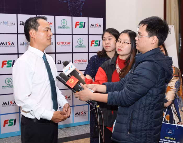 Ông Nguyễn Khoa Bảo - Phó Chủ tịch Hội Doanh nghiệp trẻ Hà Nội, Chủ tịch HĐQT Công ty CP Đầu tư Thương mại và phát triển công nghệ FSI, Thường trực Ban tổ chức trả lời báo chí bên lề hội thảo
