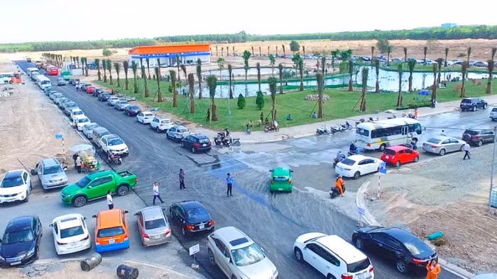 Cả ngàn chiếc xe hơi của khách hàng đi tham dự lễ giới thiệu dự án Mega City 2. Mức giá của dự án là từ 650 triệu đồng/nền.