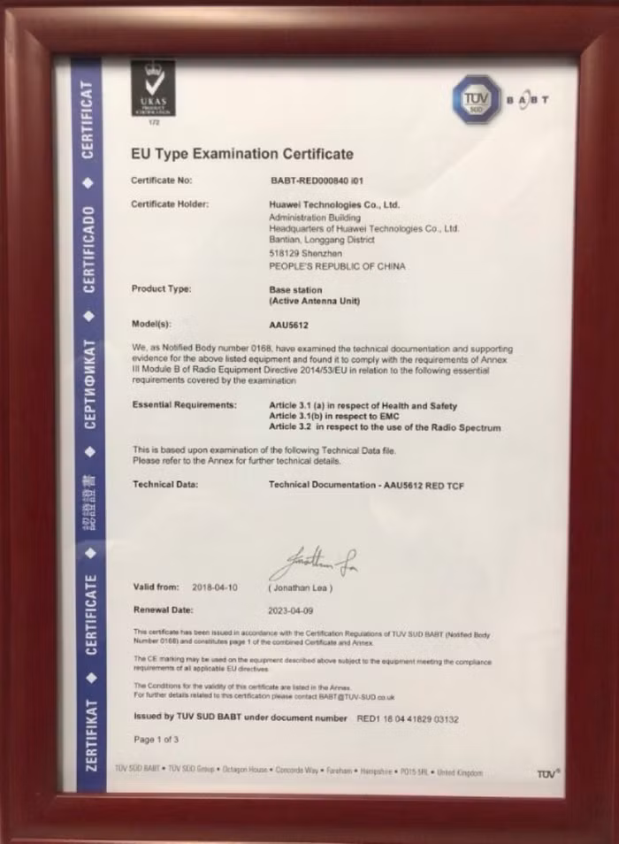 Chứng nhận hợp quy CE-TEC của Huawei đã xác định thiết bị AAU MIMO Massive C-ban 5G được phát triển dựa trên tiêu chuẩn 3GPP TS 38.104. Được thiết kế phù hợp với các kịch bản eMBB lưu lượng truy cập lớn, AAU có thể cung cấp trải nghiệm ngoài trời có tốc độ đạt tới xGbps và độ trễ cấp độ phần nghìn giây (ms). Huawei đã tuân thủ nghiêm ngặt các quy định liên quan trong từng bước phát triển sản phẩm 5G từ lựa chọn linh kiện đến thiết kế sản phẩm. Sau nhiều vòng đánh giá và kiểm tra tỉ mỉ, các sản phẩm 5G của Huawei đã vượt qua cuộc kiểm thử của TÜV SÜD ngay trong lần thử nghiệm đầu tiên, đáp ứng tất cả các yêu cầu nghiêm ngặt của liên minh Châu Âu (CE).