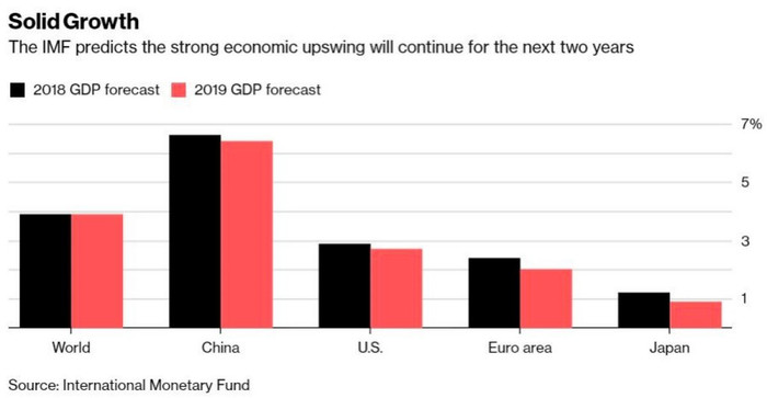 Hôm qua (17/4), Quỹ Tiền tệ quốc tế (IMF) cho biết tăng trưởng toàn cầu dự kiến sẽ đạt 3,9% trong 2018 và 2019. Năm ngoái, con số này là 3,8%, cao nhất 6 năm. IMF cũng nâng dự báo kinh tế Mỹ trong năm nay lên 2,9% (mức cũ là 2,7%).