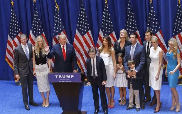 Donald Trump xuất hiện cùng những thành viên trong đại gia đình ông. Vị tỷ phú nổi tiếng này có 3 vợ và 5 người con, đa số trong số đó đều là những người có tài, có sắc như cha mẹ mình. Tổng thống Trump dành ưu ái đặc biệt cho cậu út Barron Trump và là con trai đầu tiên với người vợ hiện tại Melania Trump, cô người mẫu người Slovenia.