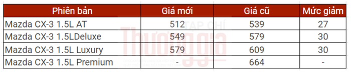 Cụ thể, Mazda CX-3 BẢN 1.5L AT tiêu chuẩn giảm 27 triệu đồng xuống mức 512 triệu. Trong khi, CX-3 bản 1.5L Deluxe giảm 30 triệu đồng, có mức giá ưu đãi là 549 triệu. Bản 1.5L Luxury cũng giảm 30 triệu, xuống còn 579 triệu. Riêng Mazda CX-3 bản cao cấp nhất 1.5L Premium vẫn giữ nguyên mức giá 664 triệu đồng.