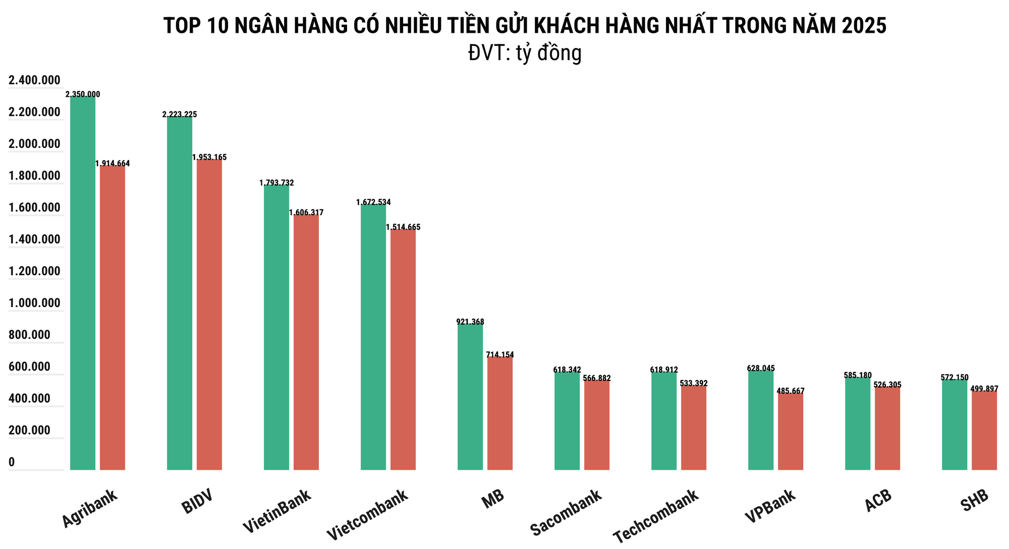 Ở góc độ quy mô tuyệt đối, nhóm ngân hàng quốc doanh tiếp tục chiếm ưu thế. Agribank dẫn đầu toàn hệ thống với số dư tiền gửi đạt 2,35 triệu tỷ đồng, tăng 22% so với đầu năm. Đứng thứ hai là BIDV với hơn 2,2 triệu tỷ đồng, tăng 14%.