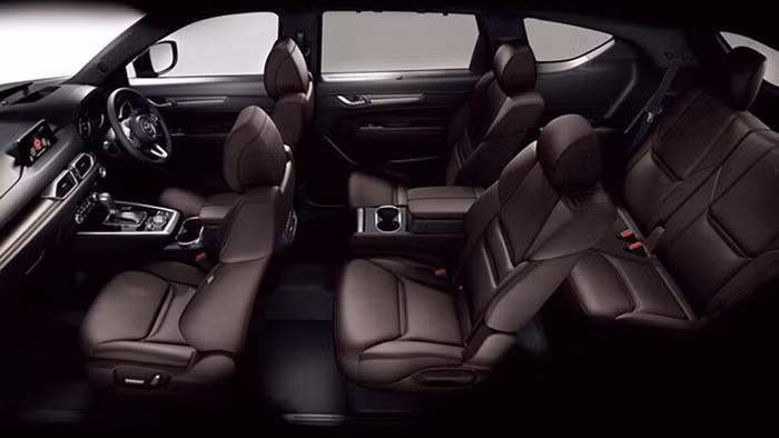 Mazda CX-8 2020 có ba hàng ghế với các thông số kỹ thuật khác nhau như công tắc điều chỉnh ghế gập giúp người dùng dễ dàng di chuyển vào hàng ghế thứ ba, hàng ghế thứ hai có tính năng hỗ trợ sưởi, giá giữ cốc và cổng USB, trang trí quanh nội thất bằng da màu đen và cổng USB ở hàng ghế thứ ba trong một số phiên bản.