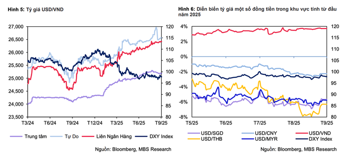 MBS nhận định, việc Fed đã bắt đầu cắt giảm lãi suất trong tháng 9 và khả năng tiếp tục giảm thêm 0,5 điểm phần trăm trong quý 4, qua đó nâng tổng mức giảm của cả năm 2025 lên 0,75 điểm phần trăm sẽ góp phần hạ nhiệt áp lực tỷ giá USD/VND. Diễn biến này cũng mở ra dư địa để Ngân hàng Nhà nước duy trì chính sách tiền tệ nới lỏng, tiếp tục giữ môi trường lãi suất thấp nhằm thúc đẩy tăng trưởng kinh tế.