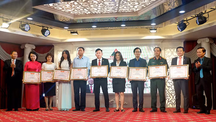 Ông Hoàng Quang Phòng - Phó Chủ tịch VCCI và ông Phạm Tất Thắng - Phó Chủ nhiệm Ủy ban Văn hóa, Giáo dục, Thanh niên, Thiếu niên và Nhi đồng của Quốc hội trao bằng khen cho các cá nhân có thành tích xuất sắc.