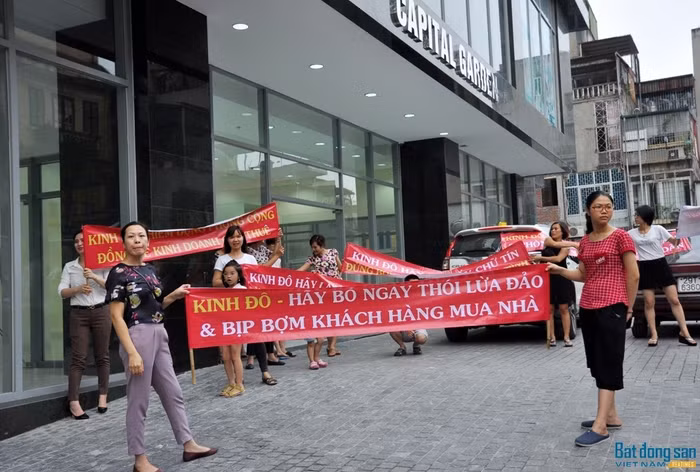 Trong đó, có cả trẻ nhỏ, phụ nữ cũng cầm băng rôn, biểu ngữ với nội dung: Kinh Đô coi thường tính mạng của hàng nghìn cư dân; Kinh Đô hãy bỏ ngay thói lừa đảo & bịp bợm khách hàng mua nhà; Kinh Đô bàn giao nhà khi hệ thống PCCC chưa được nghiệm thu…