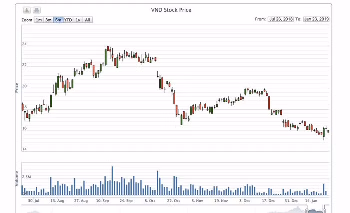 Trên sàn chứng khoán, giá cổ phiếu VND đã rơi “thẳng đứng” từ mức 24.000 đồng/CP xuống đáy 16.500 đồng/CP vào tháng 10/2018 trong đợt “bão” thị trường giảm sâu vừa qua. Cuối năm 2018 cổ phiếu VND có sự hồi phục đáng kể cùng nhịp hồi của thị trường song chỉ nỗ lực vượt lên mốc 20.000 đồng/CP sau đó tiếp tục “đổ đèo” liên tục. Trong phiên sáng nay 23/1/2019, cổ phiếu VND giao dịch ở mức 15.800 đồng/CP, tức giảm tới 34% chỉ trong vòng 3 tháng qua.