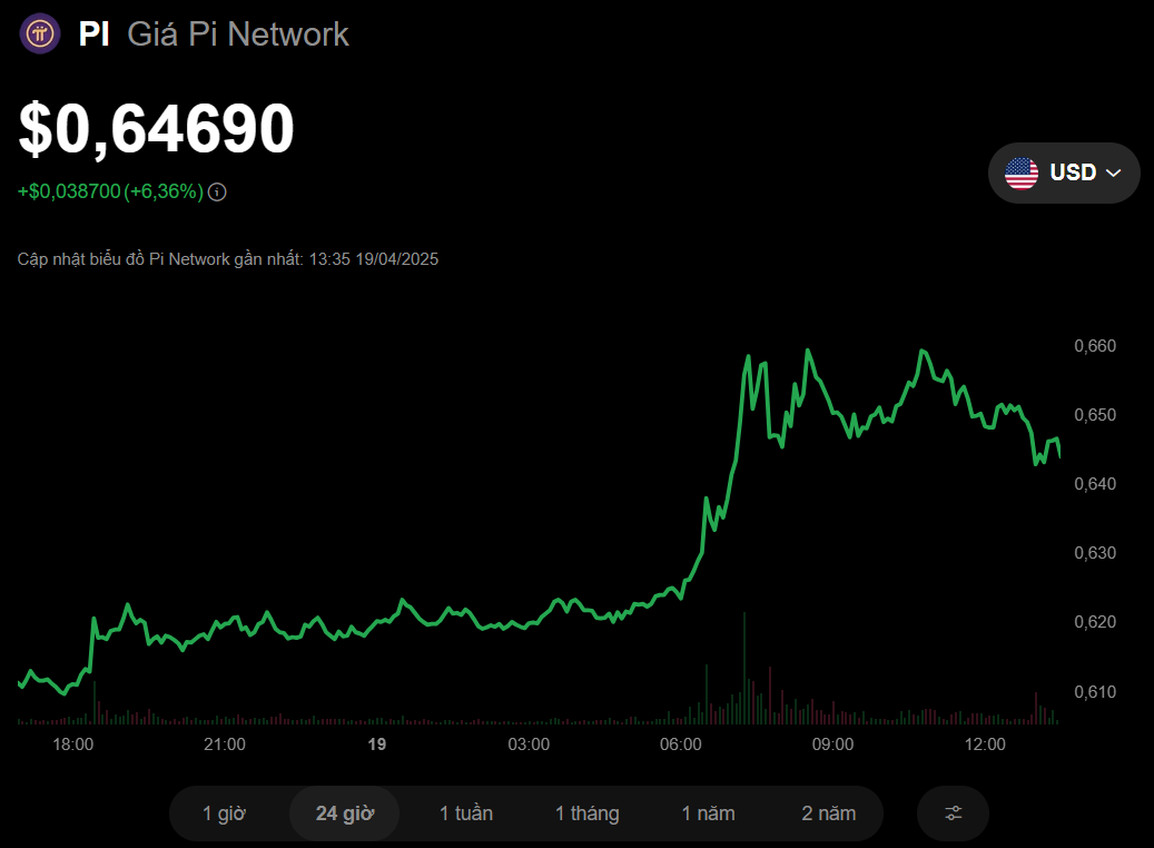 Ghi nhận vào khoảng 13h ngày 19/4, Pi đang được giao dịch trên sàn OKX quanh vùng giá 0,64 – 0,66 USD/Pi (tương đương hơn 16.000 đồng/Pi), tăng hơn 6% trong 24 giờ qua. Với tổng vốn hóa pha loãng hoàn toàn là 4,47 tỷ USD. Hiện tại, tiền điện tử Pi Network nắm giữ vị trí thứ 24 về vốn hóa thị trường.