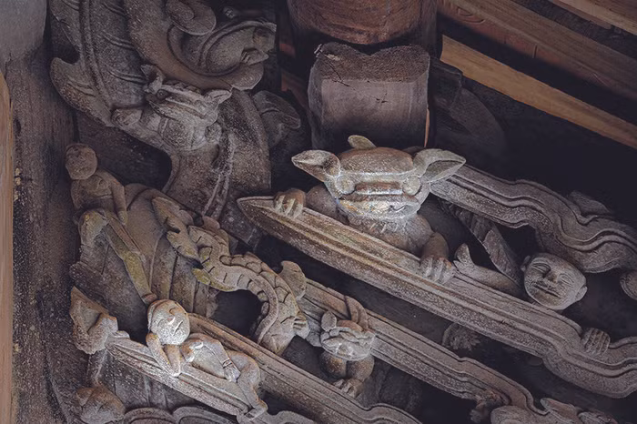 Nghê trêu gẹo chàng trai ngắm trộm thiếu nữ khỏa thân – chạm khắc đình làng