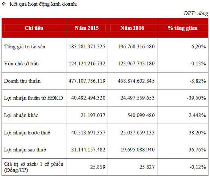 Lợi nhuận sau thuế chỉ đạt 19,7 tỷ, giảm gần 37% so với 2015. Giá trị sổ sách của công ty là 25.827 đồng/CP.