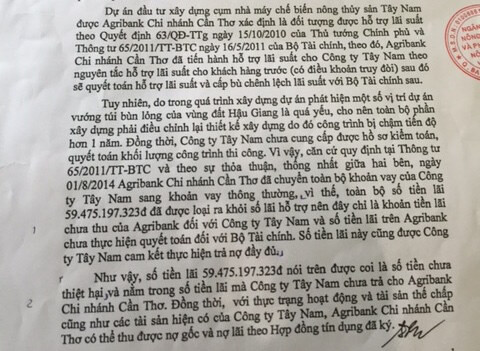 “Số tiền lãi hơn 59,4 tỷ đồng được coi là số tiền chưa thiệt hại và nằm trong số tiền lãi mà công ty Tây Nam chưa trả cho Agribank Cần Thơ. Đồng thời, với hiện trạng hoạt động và tài sản thế chấp cũng như tài sản hiện có của khách hàng, ngân hàng có thể thu hồi được nợ gốc và lãi theo hợp đồng tín dụng đã ký”- văn bản của Agribank gửi công an Cần Thơ ngày 25/3/2016 nêu rõ.